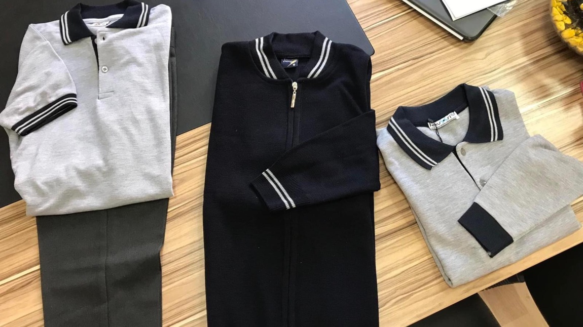 Okulumuz kıyafeti resimde görüldüğü gibi gri tişört ve gri uzun kollu sweat, lacivert hırka, füme veya gri kanvas veya kumaş pantolondur.